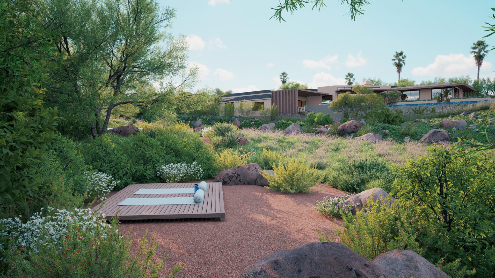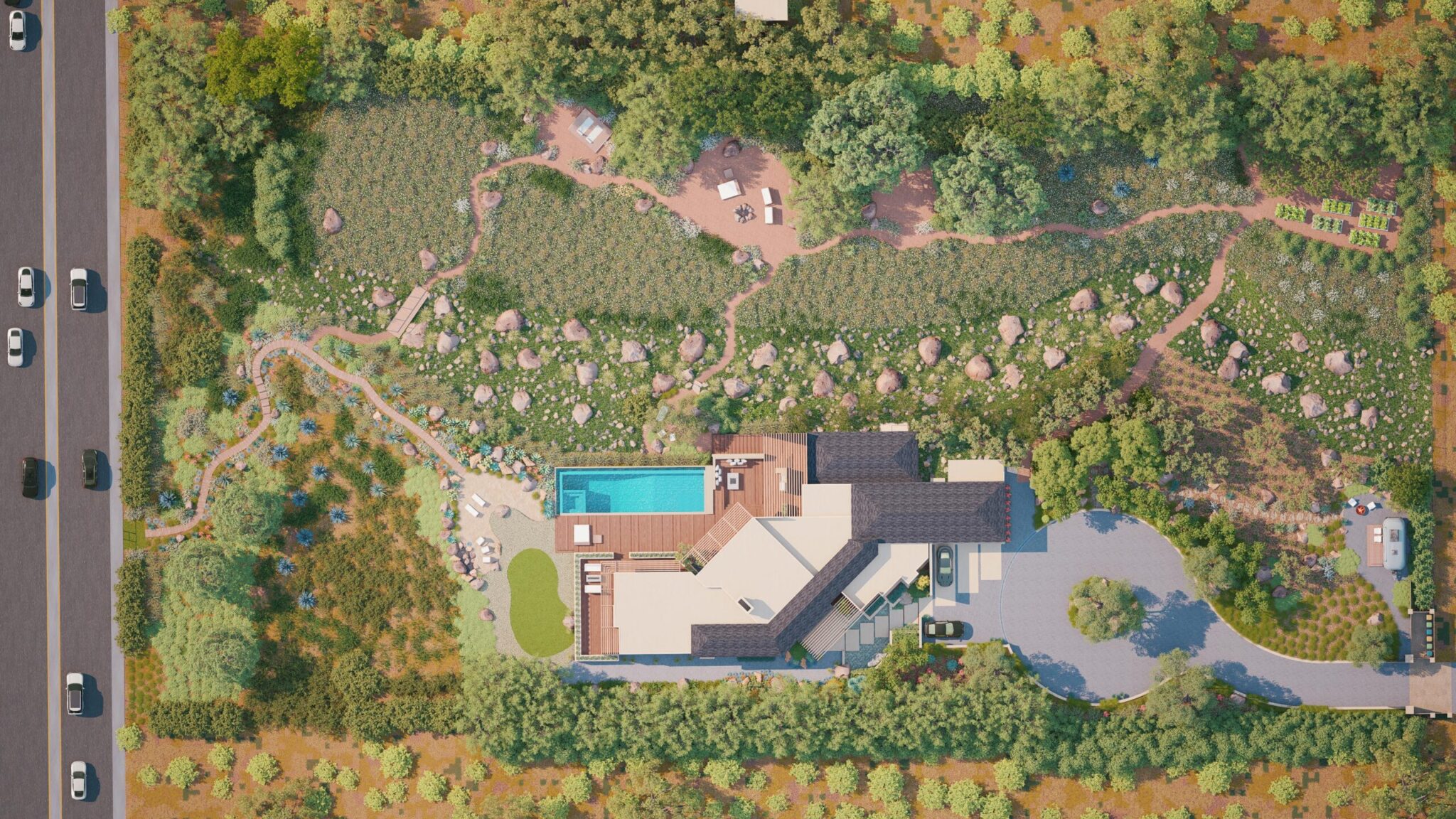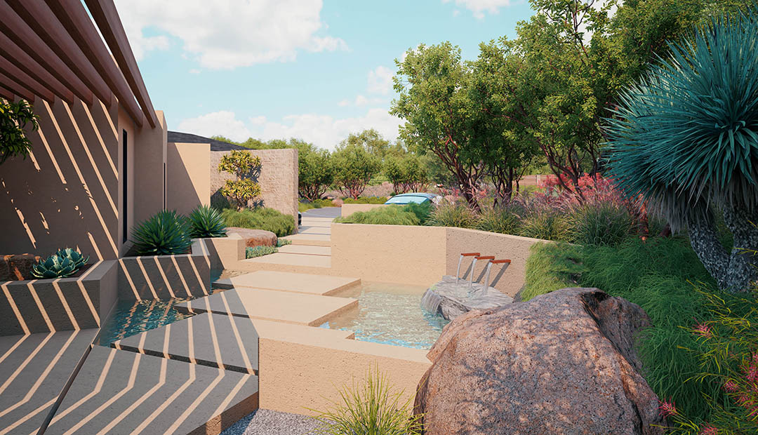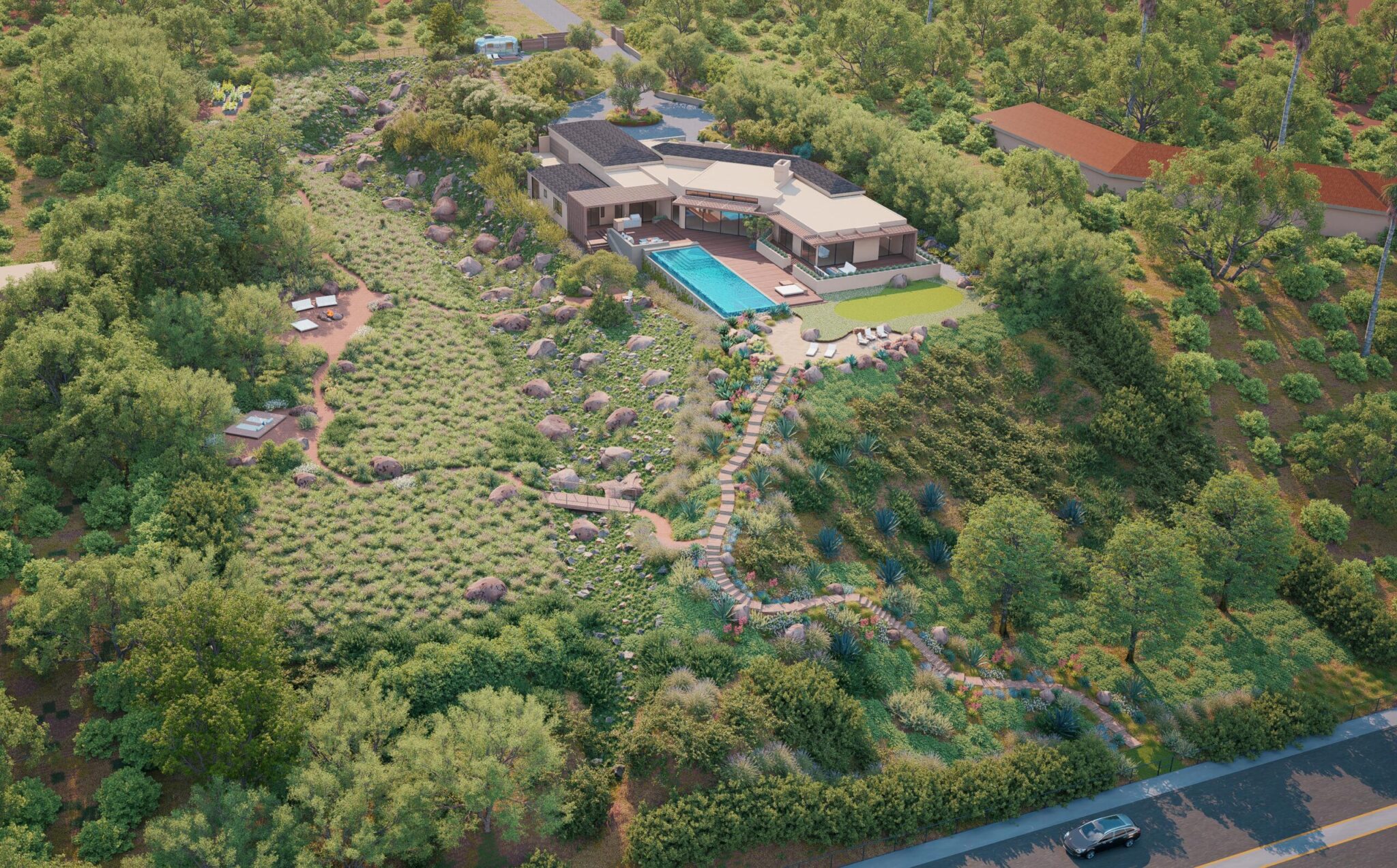 Our approach to designing this home’s vast outdoor spaces required balancing the specific lifestyle needs the client desired with the unique essence of the land. Exercising restraint, utilizing natural materials, and with serenity as our objective, we integrated the contemporary character of the new architecture seamlessly into its expansive natural surroundings. Situated on an environmentally sensitive bluff within the Malibu city limits, my design implemented a mostly native, drought-tolerant planting plan, adhering to strict fire codes and stormwater pollution control regulations. Through the design and discovery process, we created several inviting outdoor spaces that inspire a deep connection with the land for everyone fortunate enough to live and visit there.